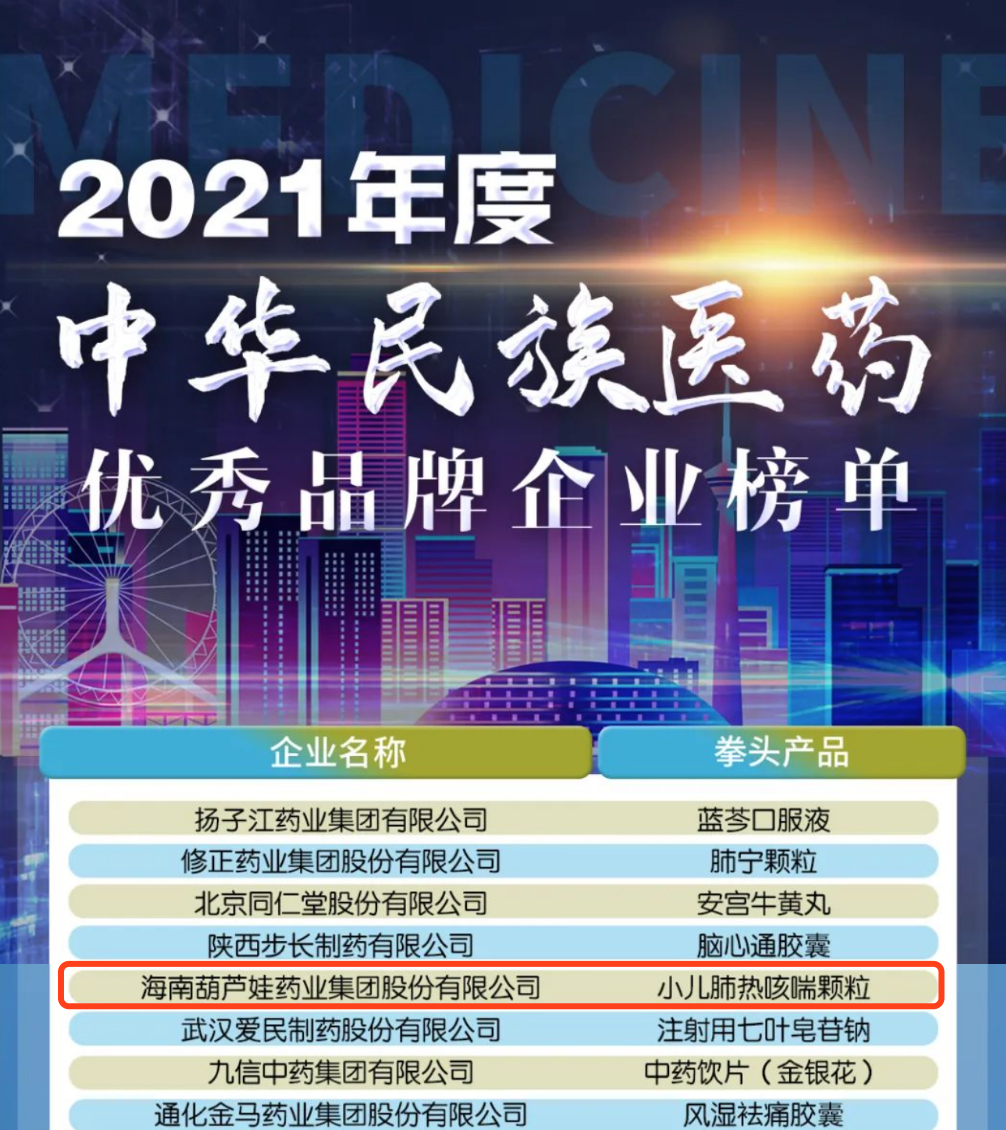 12月29日,全国工商联医药业商会发布了“2021年度中华民族医药优秀品牌企业榜单”,OG视讯药业集团凭借黄金单品小儿肺热咳喘颗粒(4克)实力登榜。